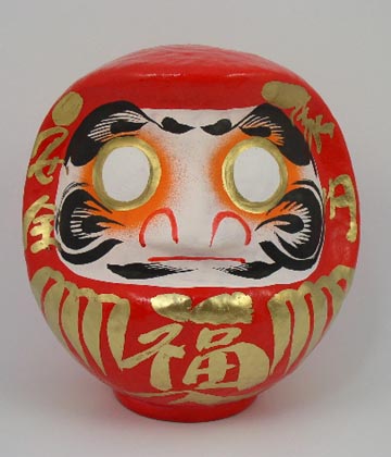 Para acabar este pequeño y escueto recorrido por dos de los amuletos japoneses a mi entender más curiosos, pasamos a ver el Daruma o Bodhidharma. Esta esculturilla representa a un monje del siglo V, padre del Zen, que meditó durante 9 años totalmente aislado y quieto ataviado con un manto rojo que le tapaba todo el cuerpo, para llegar al satori, perdiendo sus ojos manos y piernas por el camino…
